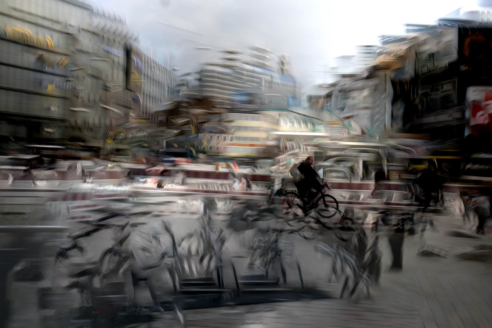Besonders gut gefallen hat mir unter anderem ein Bild zum Thema ‚Mehrfachbelichtung‘ von Franz Gockel, dass er mit ‚Radler am Jahnplatz‘ benennt. Von neun im Bracketing-Verfahren aufgenommenen Bildern wurden sechs Aufnahmen in Photoshop gestapelt verrechnet. Das Ergebnis ist eine chaotisch wirkende Stadtszene mit versetzten, sich wiederholenden Bildelementen, verwischten Gebäuden, Absperrungen und einem relativ scharf abgebildeten Radfahrer, der durch das Bild fährt. Interessant und dekorativ bearbeitet sind auch die Deichschafe, die von Jürgen Franzen zum Thema ‚Verfremdung‘ neu eingekleidet wurden. Ihre Körper zeigen sich im Bild in unterschiedlichen, farbigen Dessins. Eine Alltagsszene, die durch die außergewöhnliche Bearbeitung zum Hingucker wird. Heinrich Prochnau hat eine bekannte Filmszene nachgestellt: Die Ansicht des Vollmondes, in dessen hellem Schein ein fliegender Radfahrer unterwegs ist. E.T., der Außerirdische lässt grüßen! Interessant sind auch seine Selbstportraits, die er in Mehrfachbelichtung auch mit anderen Motiven zeigt. Die von Jörg Schürmann fotografierte Nachtansicht einer alten, engen Gasse mit Kopfsteinpflaster, beleuchteten Fenstern und Fachwerk im Hintergrund begeistert mit schönen, warmen Farben. Aber auch alle anderen, hier nicht erwähnten Bilder der ‚Brackweder Fotofreunde‘ sind sehenswert.