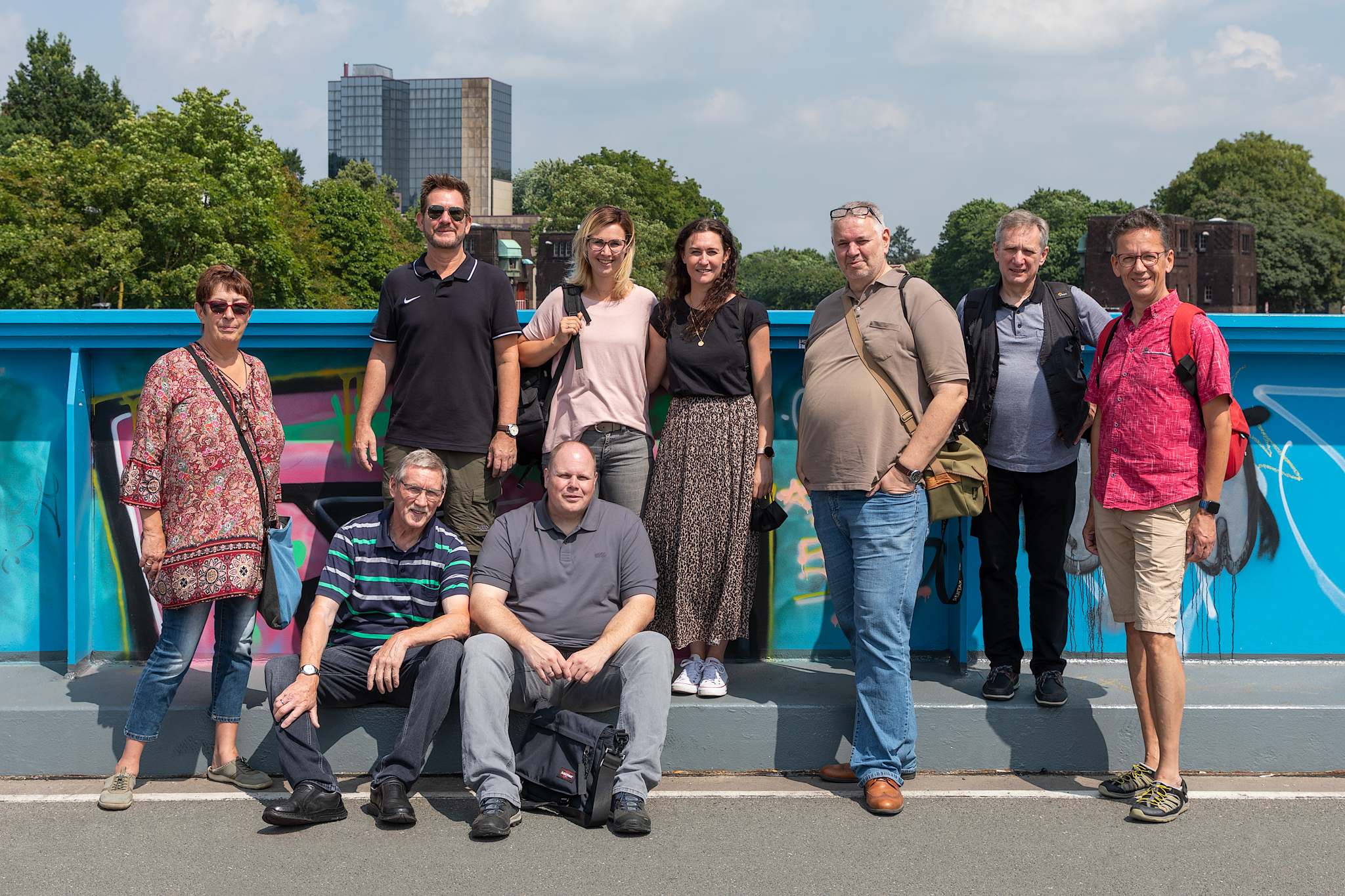 Die Anreise der ExifCafé-Mitglieder hat sich für diese Ausstellung in jedem Fall gelohnt, aber damit war der Tag ja längst noch nicht zu Ende. Nach dem Ausstellungsbesuch war Zeit für eine Pause und Gelegenheit für Diskussionen zur Ausstellung und anderen Themen. Auf dem Weg zu unserer ersten Raststätte überquerten wir die Hunte, als die Frage zu einem Gruppenfoto gestellt wurde. Ohne Stativ ein etwas schwieriges Unterfangen, wenn alle auf dem Bild sein wollten, aber das breite Brückengeländer bot ausreichend Platz zur Auflage der Kamera. Kameraeinstellungen vornehmen, Selbstauslöser auf 10 Sekunden, kurzer Spurt zur bereits aufgestellten Gruppe – und dann nahte eine Radfahrerin! Und als das ’Vögelchen’ in der Kamera zu sehen war, fuhr die Radfahrerin exakt mittig ins Bild! Kurioser Zufall, an den wir unseren Spaß hatten! Natürlich gab es einen zweiten Versuch zum Gruppenfoto, der dann auch – ohne Fremdkörper – das gewünschte Ergebnis lieferte.
