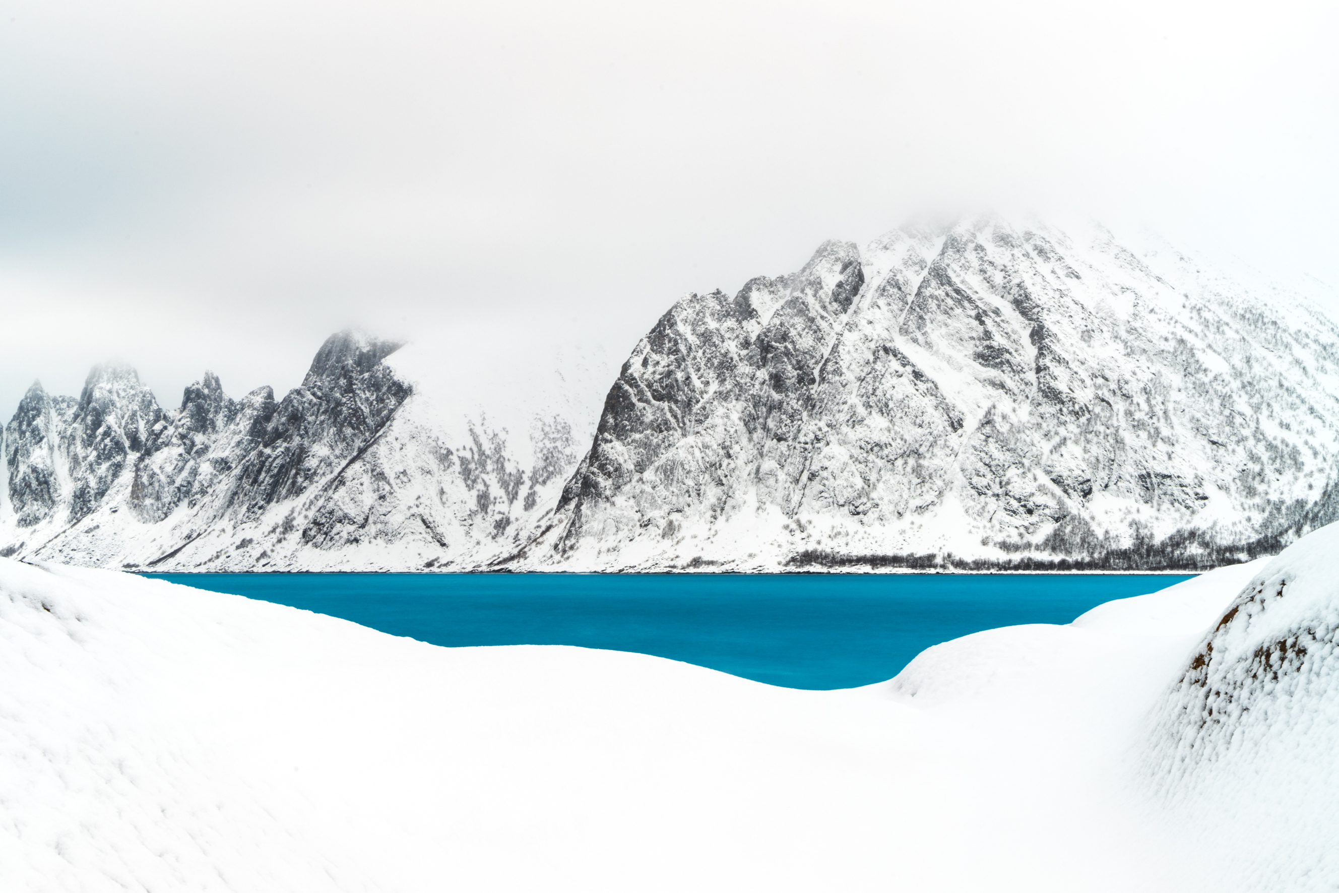 Mehrere aufmerksame Wildkatzen auf freistehenden Felsen in der Mongolei, Hornfrosch im Amazonasgebiet, der einen anderen Frosch verschlingt, spielende Schneeleoparden im Himalayagebirge, Fjordlandschaft bei Senja in Norwegen, die mit verschneiten Felsgebirgen und dem kontrastierendem Blau des Fjordwassers zu meinem diesjährigen Favoriten wurde, ein von Rotlachsen umzingelter Bär im Kurilensee in Kamtschatka, Drohnenbild von Lavaströmen des Geldingadalier-Vulkan in Island, das Auge eines Buckelwals, aufgenommen bei Moorea in Französisch-Polynesien, ein auf einem Baum schlafender Leopard in Kenia, eine Oryxantilope im Sonnenlichtstreifen auf einer großen Sanddüne der Namib-Wüste, Polarwölfe auf Ellesmere Island in Kanada, Detailaufnahme vom Farbspektrum der Schuppen einer Kreuzotter, Steinschmätzer vor irisierenden Wolken im Nationalpark Hohe Tauern, zwei Alpenschneehühner in Schneelandschaft vor einem schmalen, blauen Fjordwasserstreifen in Varanger, Norwegen, Margeriten vor Sonnenuntergang in Kantabrien, Düne im Sandsturm im Death Valley Nationalpark, USA, geheimnisvolle Form einer Schlange in durchleuchteter Blattstruktur in China und auch das Foto ‚oben oder unten‘ in der Kategorie ‚Artists on Wings‘ von Jenny Loreen Zierold.