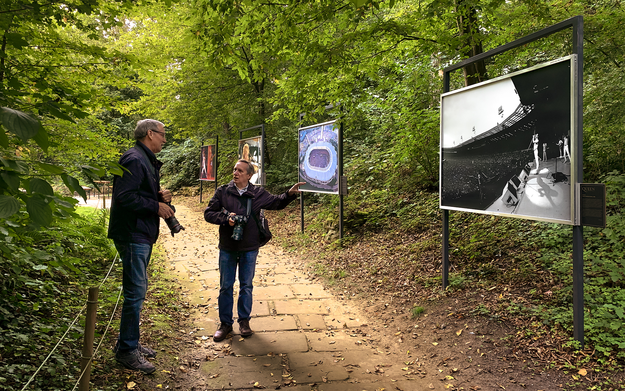 Die großflächigen Fotografien sind auf wetterfesten Alu-Dibond-Platten gedruckt, die überwiegende Anzahl der Bilder sind schwarz/weiß gehalten. Durch die Größe der aufgestellten Fotografien von 180 x 120 Zentimetern wirken die Bilder sehr lebendig. Bezüglich der Auflösung mancher Bilder muss man bedenken, dass die seinerzeitige analoge Technik nicht mit der aktuellen digitalen Fotografie und den heutigen Bearbeitungsmöglichkeiten vergleichbar ist. Bilder, die eine Geschichte erzählen, sind jedoch wesentlich wichtiger als Technik – und eigentlich gehört die zeitgemäße Art der bildlichen Ausführung zu einer Dokumentation dazu. Überrascht hat uns während der Betrachtung der plakativen Exponate die musikalische Begleitung unterwegs. Über versteckte Lautsprecher in den Anlagen neben den Wegen werden die weltbekannten Songs von ’Queen’ wiedergegeben und damit die optischen Eindrücke mit akustischer Unterstützung verstärkt. Das kommt sehr gut an!