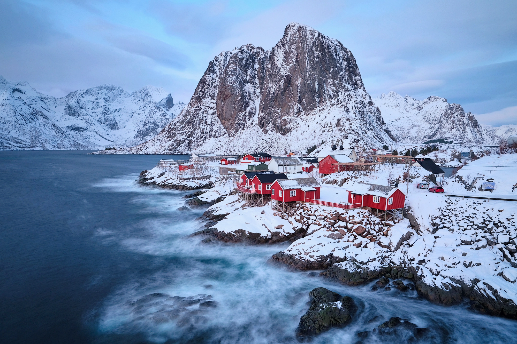 Es ist einfach immer wieder begeisternd zu sehen, mit welcher Klarheit und unvergleichlichen Lichtverhältnissen sich Norwegens Landschaften zeigen, mit denen die Lofoten auch in den Wintermonaten besondere Ansichten bieten. Zerklüftete, felsige Inselorte, auf denen bunte Holzhäuser im Kontrast zu den schneebedeckten Felsen vor hohen Bergen stehen. Stockfischgestelle mit Kabeljau, die draußen ohne Wetterschutz aufgestellt sind (…und keine Möwe interessiert sich dafür!) und Fischerboote, die an Land oder auch auf den teilweise vereisten Wasserflächen liegen, sind eine Kulisse, die geradezu zum Fotografieren auffordert. Der Himmel zeigt sich mit wechselndem Wetter, über Sonnenstand, Wolkenbildungen und -strömungen oft in märchenhaft schönen Farben, die umliegende Landschaften, Berge und Wasser im magischen Licht erscheinen lassen. Auch nach dem frühen Sonnenuntergang im Winter bewirkt das Restlicht noch lange eine unvergleichliche Stimmung. Ein Motiv-Eldorado für Fotografen!