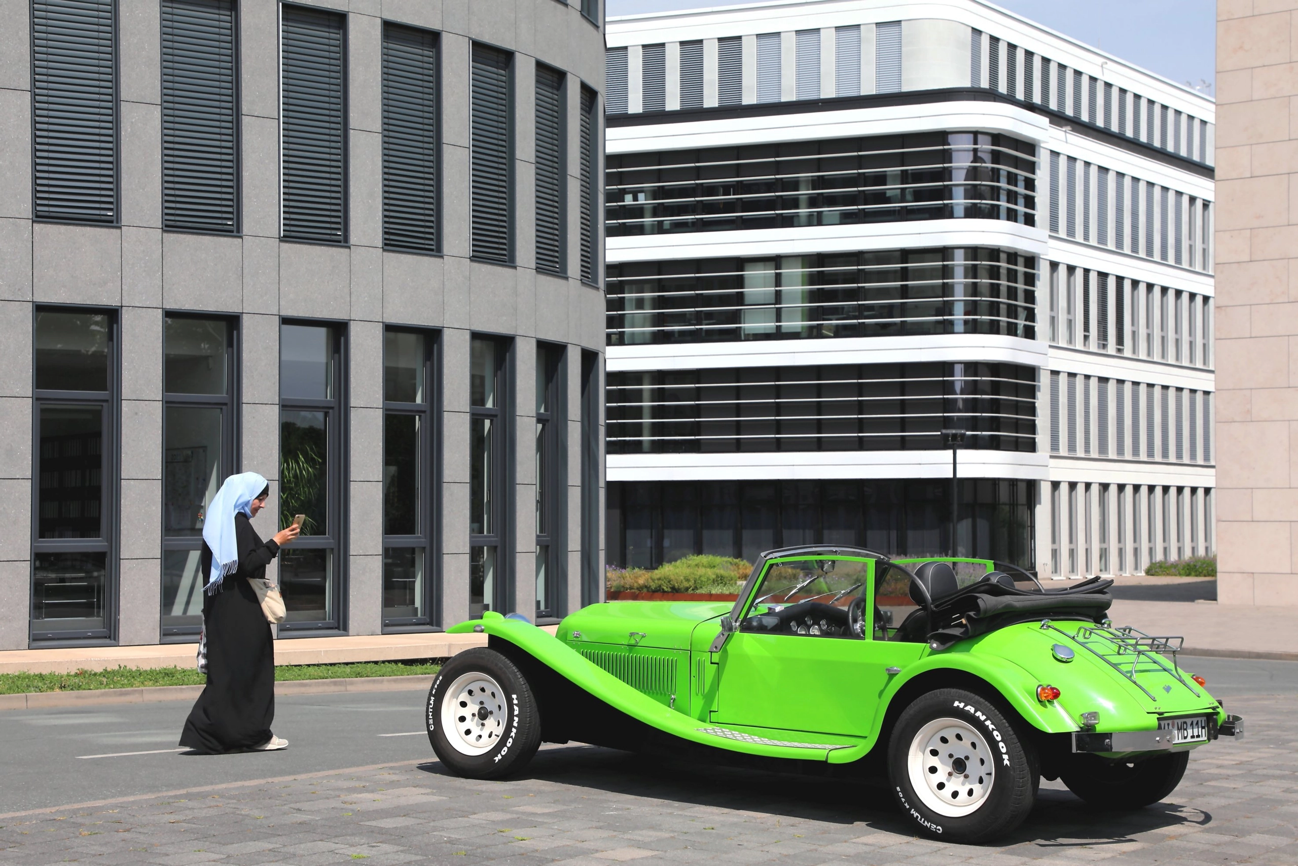 Mein Bild des Jahres habe ich beim British Day des Lenkwerks in Bielefeld gemacht. Bei den Oldtimer-Veranstaltungen bleibe ich meistens bis zum Schluß, immer in der Hoffnung, dass ich auf dem sich leerenden Ausstellungsgelände noch einen freistehenden Oldtimer ohne Personen vor ansprechender Architekturkulisse fotografieren kann. Eine andere Besucherin in traditioneller Abaya hatte jedoch den gleichen Gedanken wie ich und beschäftigte sich mit ihrem Handy und einem freigestellten Marlin Sportscar über einen längeren Zeitraum, der mir deutlich zu lange dauerte. So habe ich dann Fotos vom Oldtimer mit der Besucherin gemacht, weil ‚im Weg stehende Personen‘ meistens zur Seite gehen, wenn sie merken, dass sie fotografiert werden. Aber letztlich konnte auch ich den Oldtimer ohne Personen ablichten. Zu meinem Erstaunen gefiel mir bei der Auswertung der Bilder ein Foto mit der Person im Bild deutlich besser als die Bilder des Oldtimers in moderner Architekturkulisse ohne Person. Für mich ist es ein Bild mit inhaltlichen Gegensätzen und Vergleichen, das Platz für individuelle Interpretationen lässt.