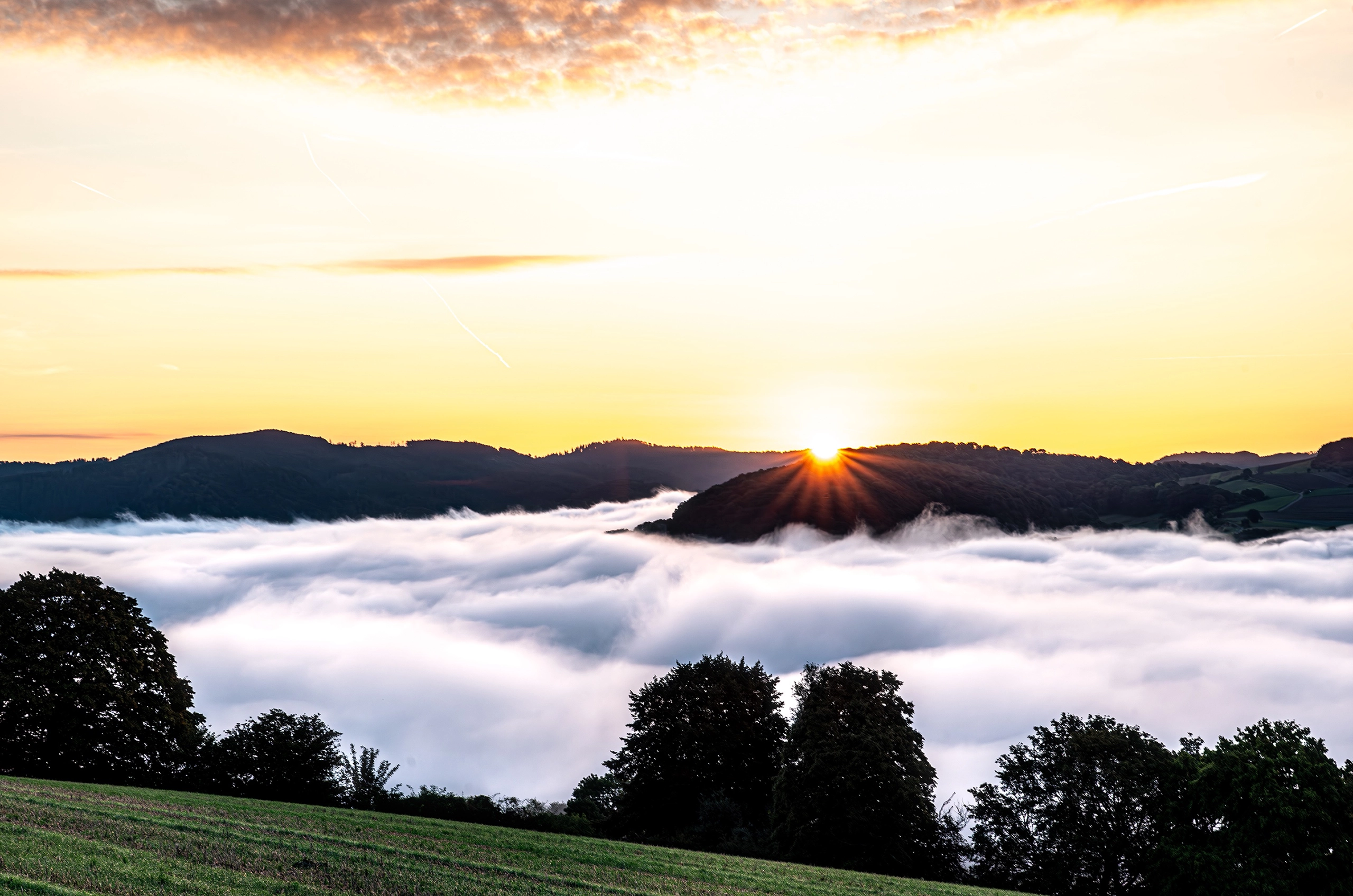 Dieter wollte ursprünglich nahe seinem Heimatort den Nebel vor Sonnenaufgang in einer Landschaftsaufnahme festhalten. Leider zeigte sich über der betreffenden Landschaft jedoch kein Nebel, so dass er etwas enttäuscht einige Kilometer zum Rand der Hochebene weiter fuhr, wo die ’13 Kurven‘ ins Wesertal hinab führen. Er war sehr überrascht und nahezu ergriffen, was er dort sah: Über einem klaren Himmel lag das gesamte Wesertal im Nebel, man hatte den Eindruck, über den Wolken zu stehen. Einen zusätzlichen Gänsehaut-Moment erlebte er, als die Sonne langsam über dem Bergkamm aufging und den Himmel über dem Nebelmeer in goldenen Farben erscheinen ließ. Ein außergewöhnlicher Glücksmoment, der sein frühes Aufstehen belohnte!