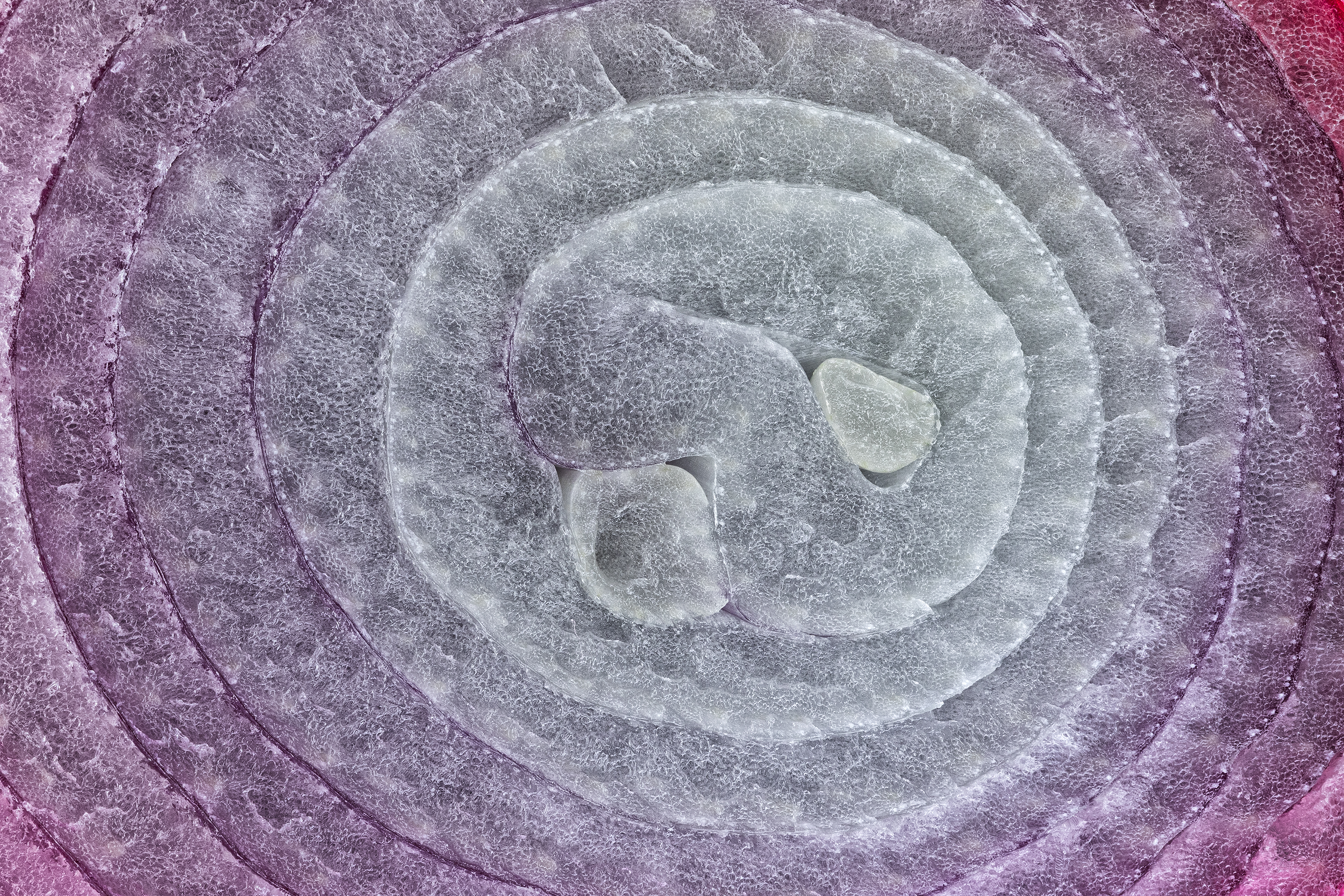 Alfred legte die kreative Messlatte mit dem ersten Beitrag auf ein hohes Level. Wenn das Internet in der Lage wäre, die atmosphärische Umgebung seines Motivs mit allen Sinnen zu empfangen, dann hätten uns die Tränen in den Augen gestanden: Eine Makroaufnahme von einer roten Zwiebelscheibe. Aufgenommen mit besonderer Technik der Dunkelfeld-Fotografie. Dazu gehört ein schwarzer Trichter, der am größeren Ausgang einen etwa ein Zentimeter breiten Rand aus weißem Papier als Lichtdurchlass von außen erhält und über die Zwiebelscheibe gestellt wird. Durch die engere Öffnung blickt das 100mm-Makroobjektiv von oben auf das Motiv, das von außen durch die weiße Papierkante von drei Blitzen angeleuchtet wird. Knackscharfe Poren, tolle Auflösung, insgesamt eine richtig gute Fotoarbeit! Dass das nicht nur mit Zwiebelscheiben möglich ist, bewies seine weitere Aufnahme von einer Apfelscheibe mit Gehäuse und Kernen auf einer von unten beleuchteten, weißen Plexiglasplatte. Auch das ist ein sehenswertes Ergebnis!