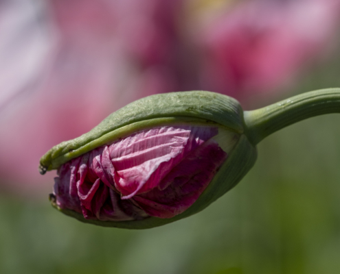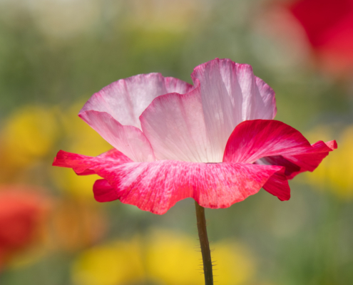 Auf einem angelegten Rundweg zwischen Schlafmohn- und Blumenwiesen mit einzelnen Mohnblumen hatte es lange gedauert, bis endlich eine geeignete Mohnblüte mit passendem Umfeld inmitten des Blumenmeers als fotografisches Motiv identifiziert wurde. Die Wiese durfte nicht betreten werden, die betreffende Mohnblume befand sich in gut fünf Meter Entfernung vom Weg. So entstand das Bild mit dem Teleobjektiv plus Konverter mit maximaler Brennweite. Um die zarte, sich ständig im Wind bewegende, kleine Mohnblüte abzubilden, musste eine möglichst kurze Verschlusszeit gewählt werden. Es bedurfte vieler Versuche, bis schließlich eine Aufnahme mit entsprechendem Hintergrund und stimmigen Focus der Mohnblüte gelang. Schon bei erster Betrachtung der Aufnahme auf dem Kameradisplay zeigte sich, wie wichtig die farbliche Zuordnung der im Unschärfebereich befindlichen Farbkomponenten anderer Blüten ist. Letztlich ist es mit Geduld und etwas Glück gelungen, die filigranen Blütenblätter im richtigen Moment und passendem Ausschnitt abzulichten. Ein Besucher der Ausstellung wurde von diesem Bild besonders inspiriert und zitierte einen kurzen Liedanfang “Ich bin schön, schaut mich an und die Blüte tanzt im Wind.” Ihn habe ich mit meinem Bild erreicht!