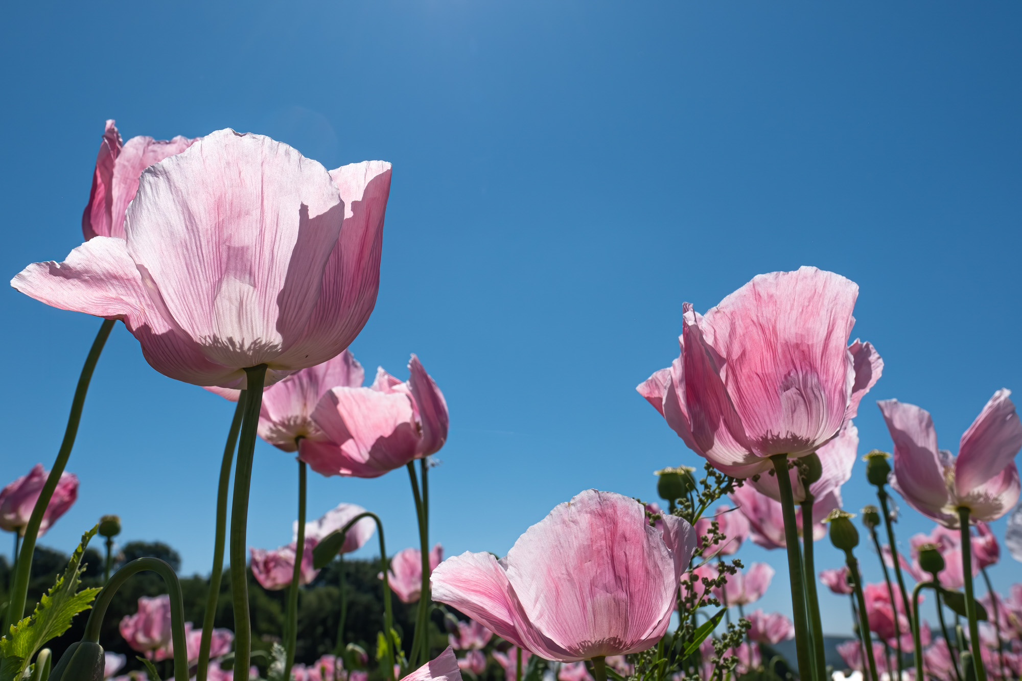 Eine der wenigen, nicht mit dem Makroobjektiv erstellten Aufnahmen: Bei der Wanderung durch die Schlafmohnfelder auf freigegebenen Wegen war es leicht, die leuchtenden, filigranen Schlafmohnblüten gegen den blauen Himmel in ihrer vollen Schönheit darzustellen. Die Blüten befanden sich auf langen Stängeln in etwa 120 cm Höhe. Kameraeinstellungen: Brennweite 24 mm, Blende f/8.